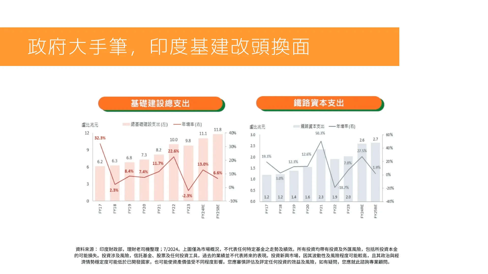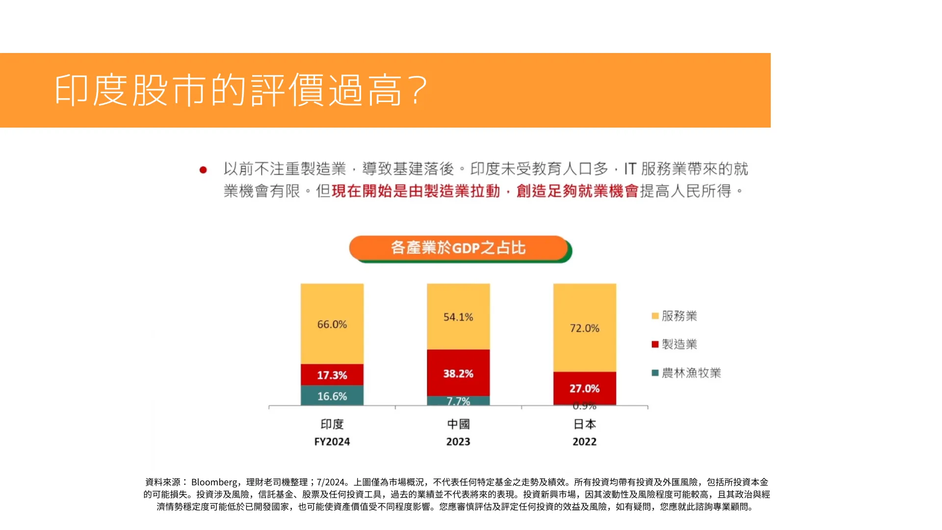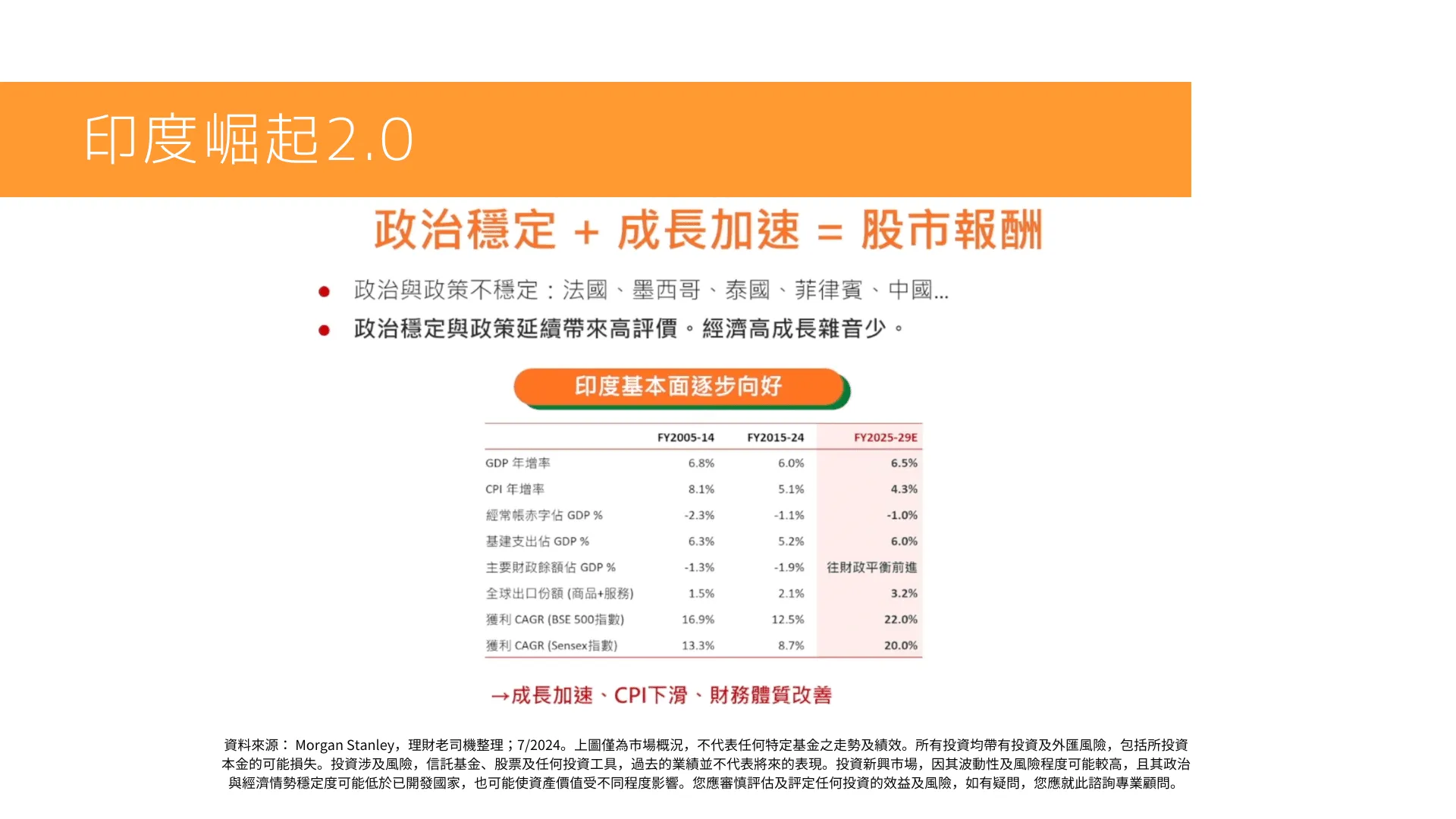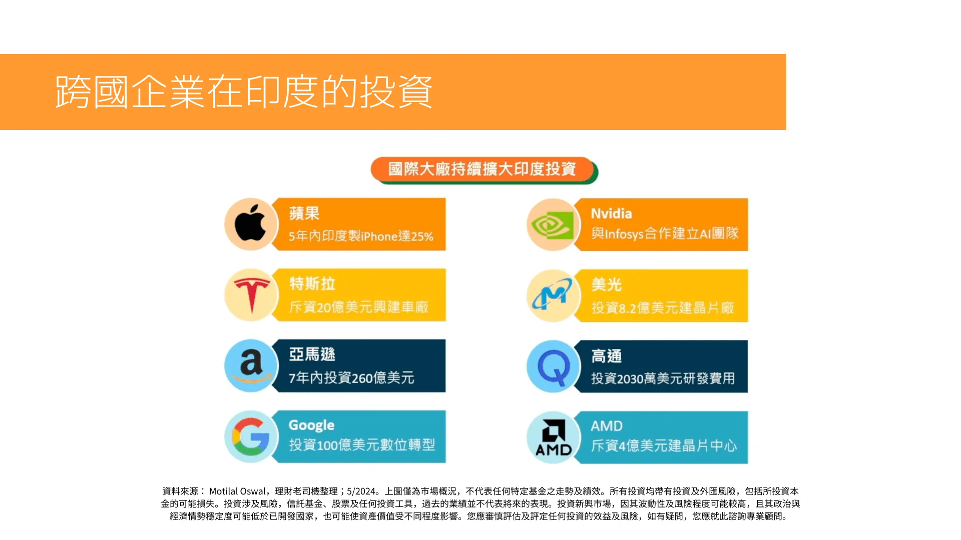 資料來源: Motilal Oswal,理財老司機整理;5/2024。上圖僅為市場概況,不代表任何特定基金之走勢及績效。所有投資均帶有投資及外匯風險,包括所投資本金的可能損失。投資涉及風險,信託基金、股票及任何投資工具,過去的業績並不代表將來的表現。投資新興市場,因其波動性及風險程度可能較高,且其政治與經濟情勢穩定度可能低於已開發國家,也可能使資產價值受不同程度影響。您應審慎評估及評定任何投資的效益及風險,如有疑問,您應就此諮詢專業顧問。