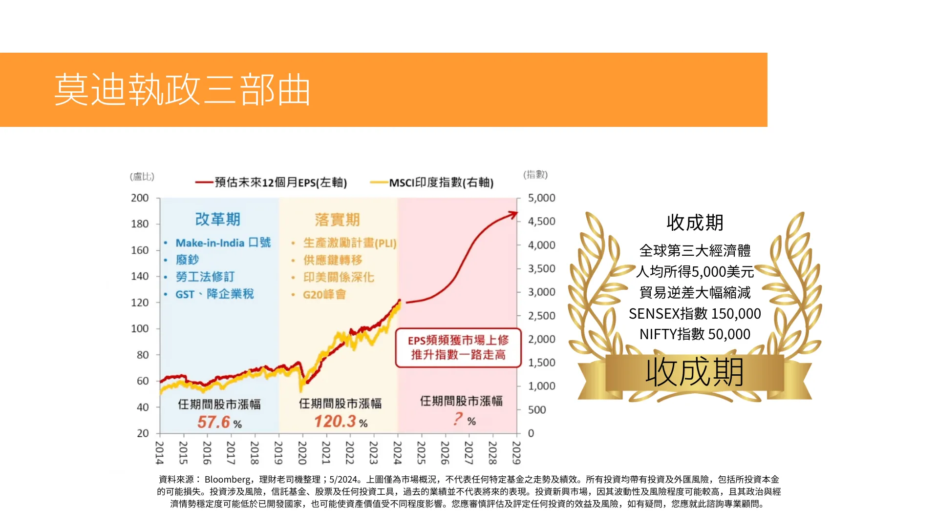 印度總理納倫德拉.莫迪(Narendra Modi) 過去打出「Made in India」口號,如今已經迎來收成期,2024年印度大選後步入第三屆任期,莫迪政府的長期改革政策也得以不斷延續及進化,產生正面效應。